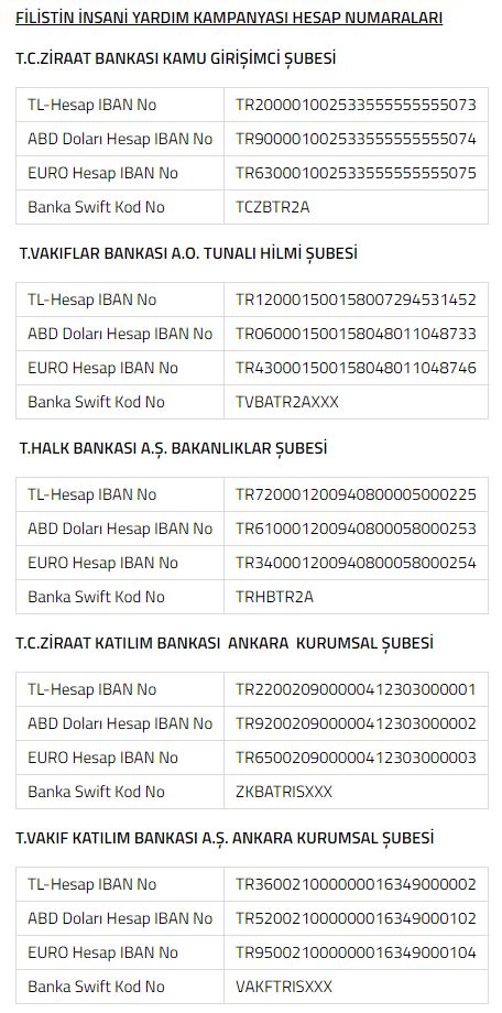 Filistin halkının karşı karşıya bulunduğu sıkıntıların hafifletilmesi amacıyla 8 Mayıs 2018 tarihli Resmi Gazete’de yayımlanan 2018/10 sayılı Başbakanlık Genelgesi ile bir yardım kampanyası başlatılmıştır. Yardım Kampanyası için kullanılabilecek hesap numaraları aşağıda sunulmaktadır.