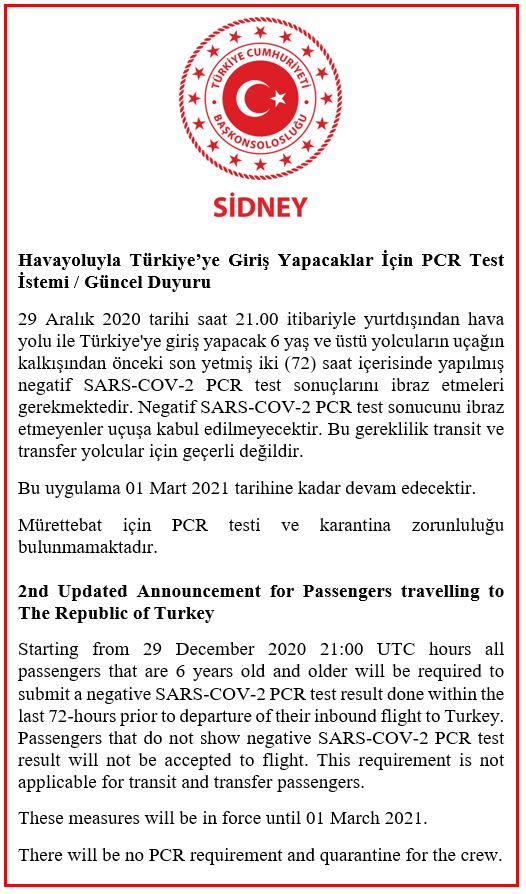 29 Aralık 2020 tarihi saat 21.00 itibariyle yurtdışından hava yolu ile Türkiye'ye giriş yapacak 6 yaş ve üstü yolcuların uçağın kalkışından önceki son yetmiş iki (72) saat içerisinde yapılmış negatif SARS-COV-2 PCR test sonuçlarını ibraz etmeleri gerekmektedir. Negatif SARS-COV-2 PCR test sonucunu ibraz etmeyenler uçuşa kabul edilmeyecektir. Bu gereklilik transit ve transfer yolcular için geçerli değildir.
