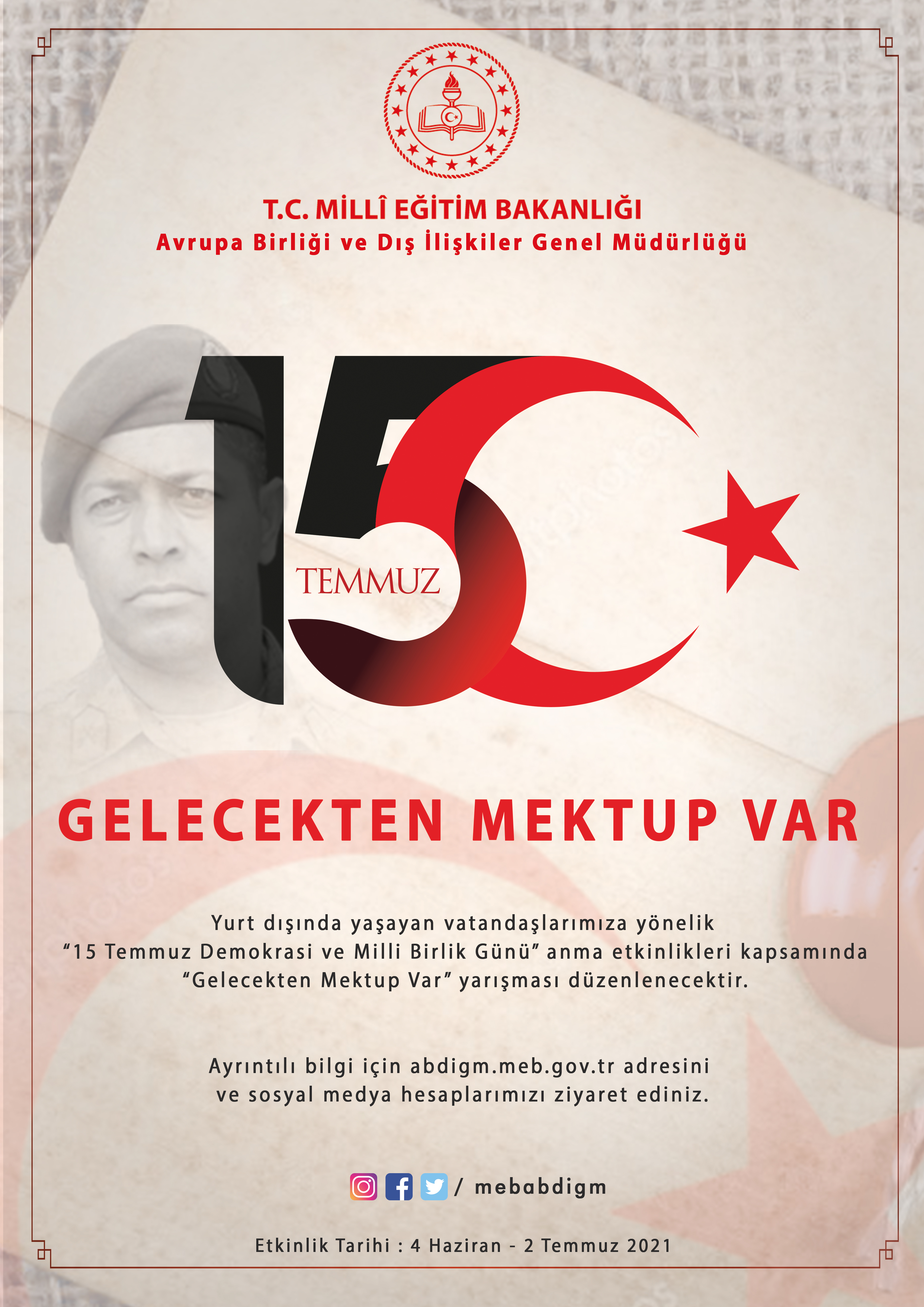 15 Temmuz Demokrasi ve Milli Birlik Günü anma etkinlikleri kapsamında yurt dışında yaşayan vatandaşlarımızın 15 Temmuz hain darbe girişimi konusunda bilinçlenmelerini sağlamak, milli birlik ve beraberlik duygularını güçlendirmek ve geleceğin Türkiye’sine olan azim ve inancı arttırmak amacıyla yurt dışında yaşayan 7-17 yaş arası çocuklarımızın katılabileceği “Gelecekten Mektup Var” yarışması düzenleneceği ve yarışma koşulları ile konuya ilişkin yurtdışındaki vatandaşlarımıza duyuru yapılması Milli Eğitim Bakanlığı’ndan alınan örneği ekli yazı ile bildirilmektedir.