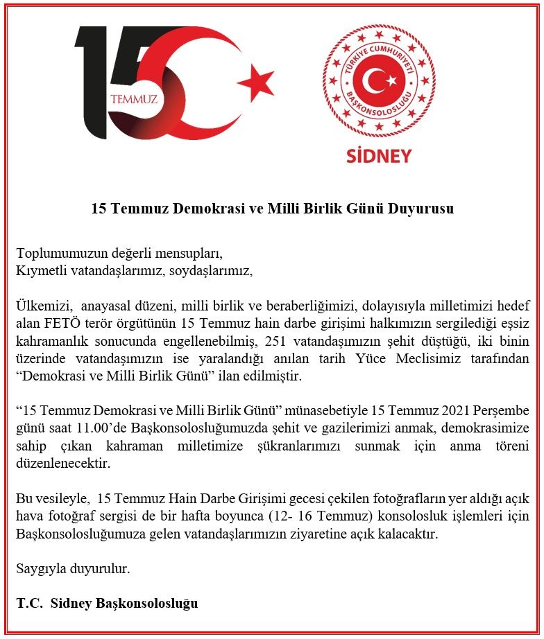 “15 Temmuz Demokrasi ve Milli Birlik Günü” münasebetiyle 15 Temmuz 2021 Perşembe günü saat 11.00’de Başkonsolosluğumuzda şehit ve gazilerimizi anmak, demokrasimize sahip çıkan kahraman milletimize şükranlarımızı sunmak için anma töreni düzenlenecektir.